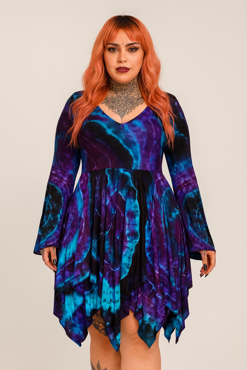 Um portal em forma de vestido. Cada detalhe desta criação nasceu do encontro entre paciência, magia e alquimia manual. O tingimento Ágata Espacial, feito fio a fio, voltinha por voltinha, transforma o tecido em um cosmos próprio — desenhos únicos que jamais se repetem, como constelações no céu noturno.