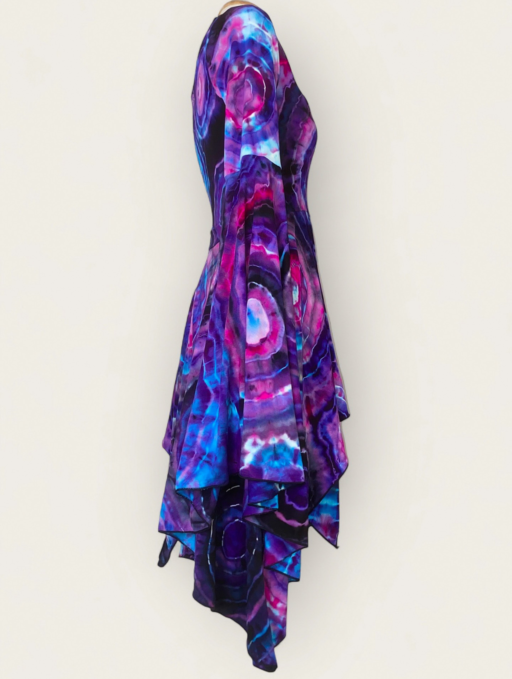 E o toque final: o nosso tingimento Candy, feito à mão com a técnica de ice dye. Uma mistura celestial de tons galácticos — azul, rosa, lilás e roxo — que transformam cada vestido em uma peça única, como você.